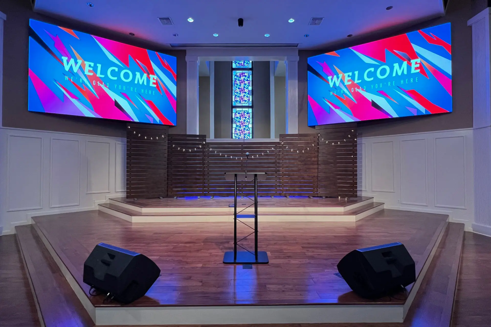 Main sanctuary backdrop: Go with a fixed indoor installation—wall-mounted or suspended.