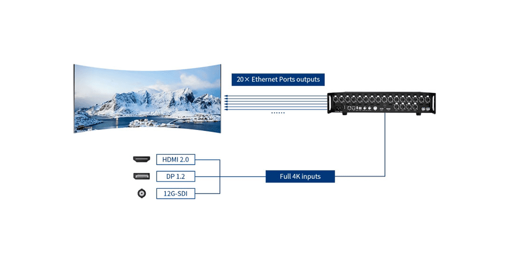 Supports HDMI 2.0, DisplayPort 1.2, and 12G-SDI inputs at up to 4096×2160@60Hz, offering flexibility with modern video sources.