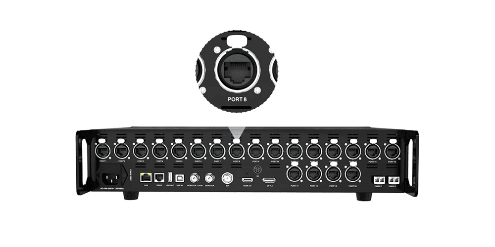 Comes with 20 Gigabit Ethernet ports (Neutrik etherCON), each capable of driving a substantial pixel load.