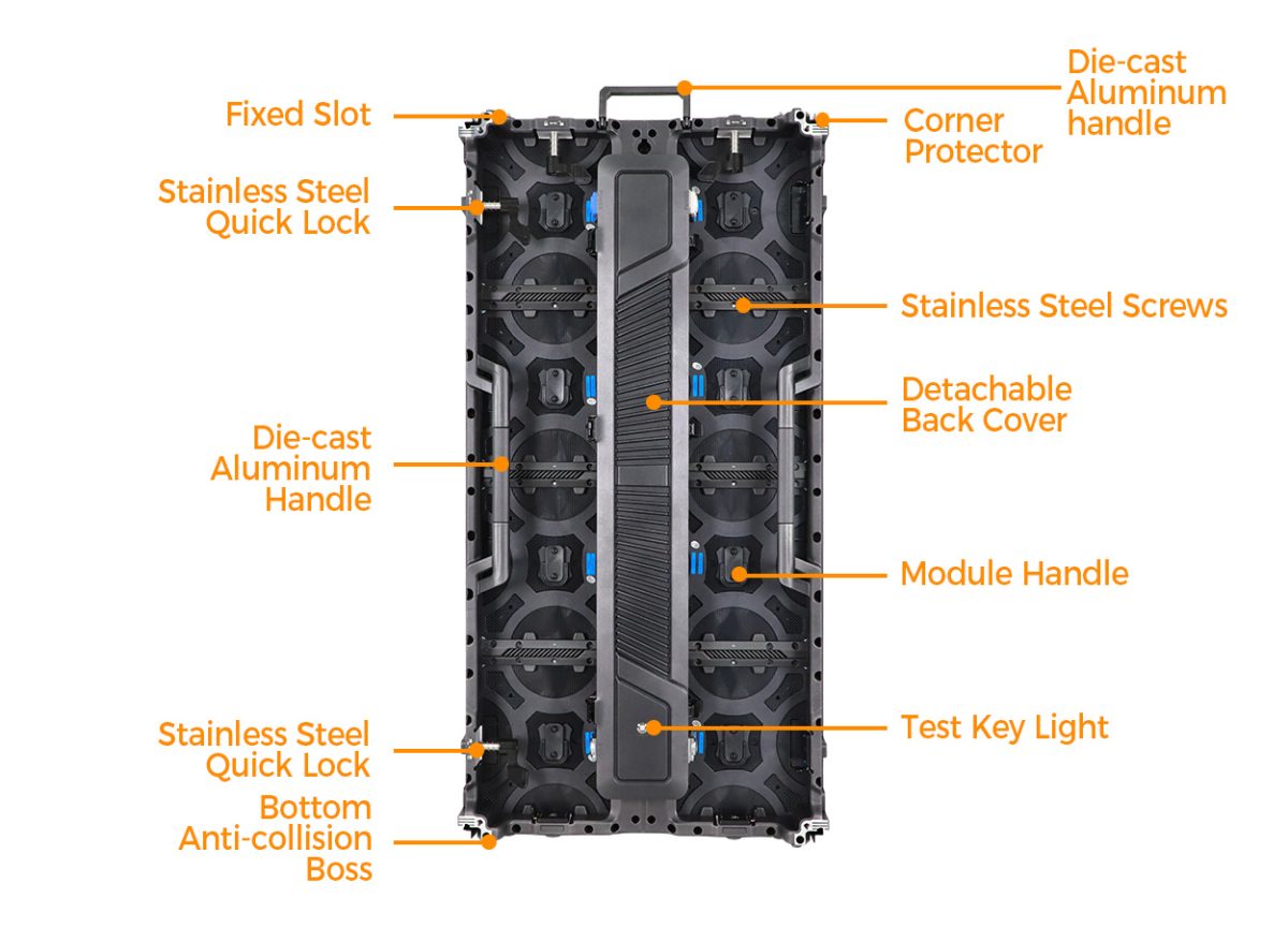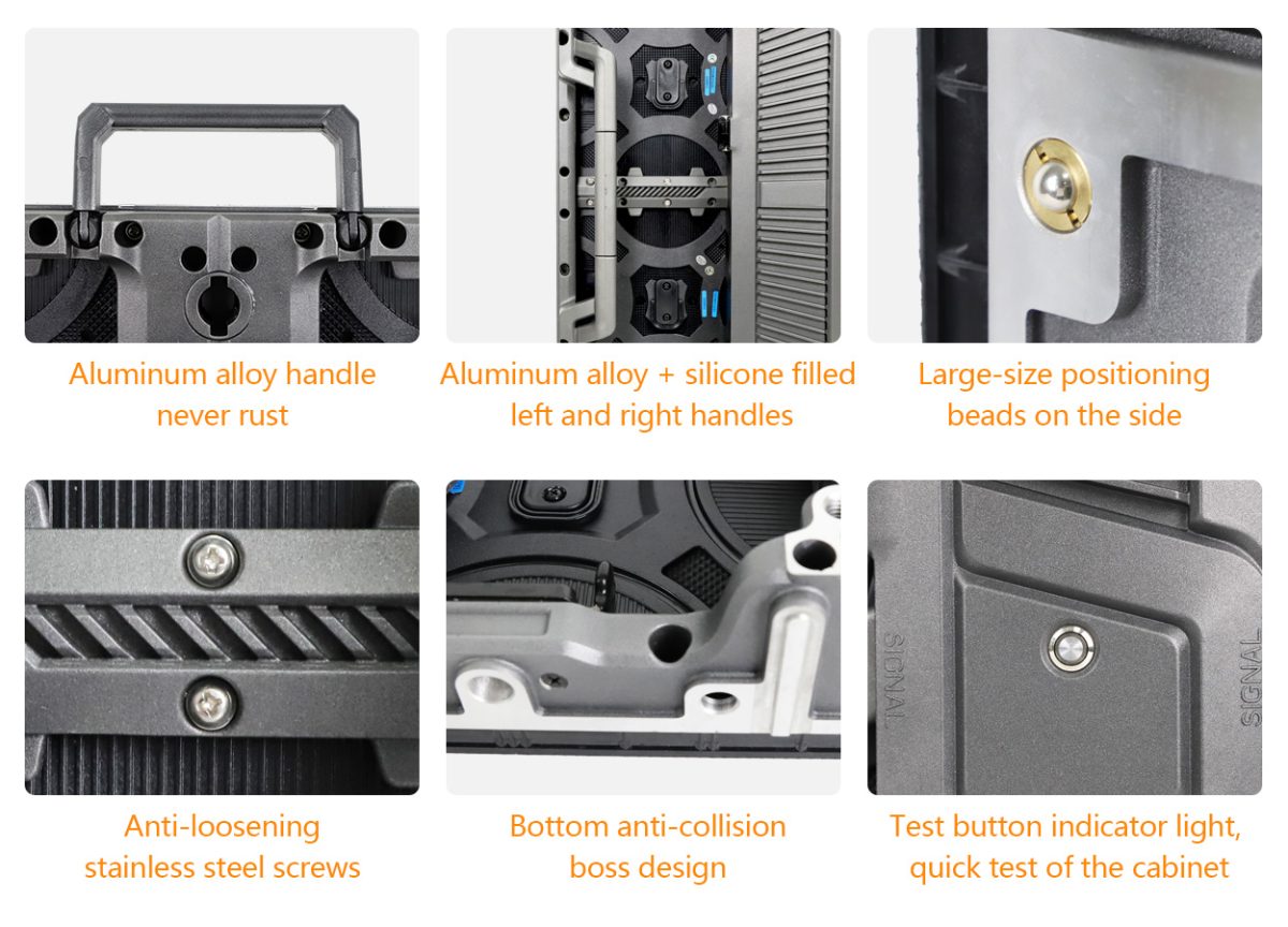 EA1000C6 rental LED display screen is built with the user in mind. It includes thoughtful features like rust-proof aluminum handles, soft silicone grips on both sides, and a bottom anti-collision design. These small but important details make the screen safer and easier to move, install, and use.